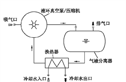 被抽氣體從吸氣口進(jìn)入液環(huán)真空泵/壓縮機(jī),經(jīng)液環(huán)真空泵/壓縮機(jī)壓縮后與部分工作液一起進(jìn)入氣液分離器,在氣液分離器內(nèi)氣液兩相得到分離,氣體從排氣口排出,工作液經(jīng)換熱器被液環(huán)泵/壓縮機(jī)吸入進(jìn)行循環(huán)使用。