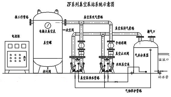 ZF系列真空泵站(又名真空發(fā)生裝置、真空負壓站等)是以一臺或二臺水環(huán)真空泵作為真空獲得設備,以真空罐作為真空存儲設備的成套系統(tǒng)。對于頻繁使用真空源而所需抽氣量不太大的場合下,該系統(tǒng)比直接使用真空泵大大節(jié)約了能源,并有效提高了真空泵的使用壽命。