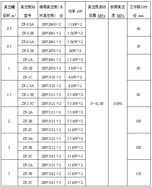 ZF系列真空泵站性能參數(shù):